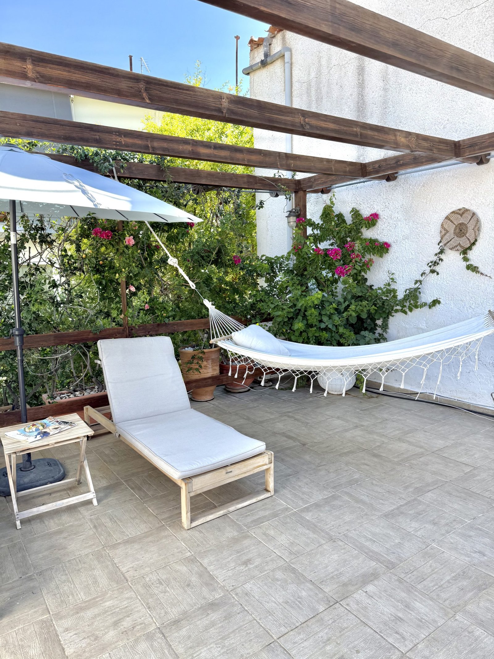 Shaded terrace on the top of the building with outdoor furniture and table.