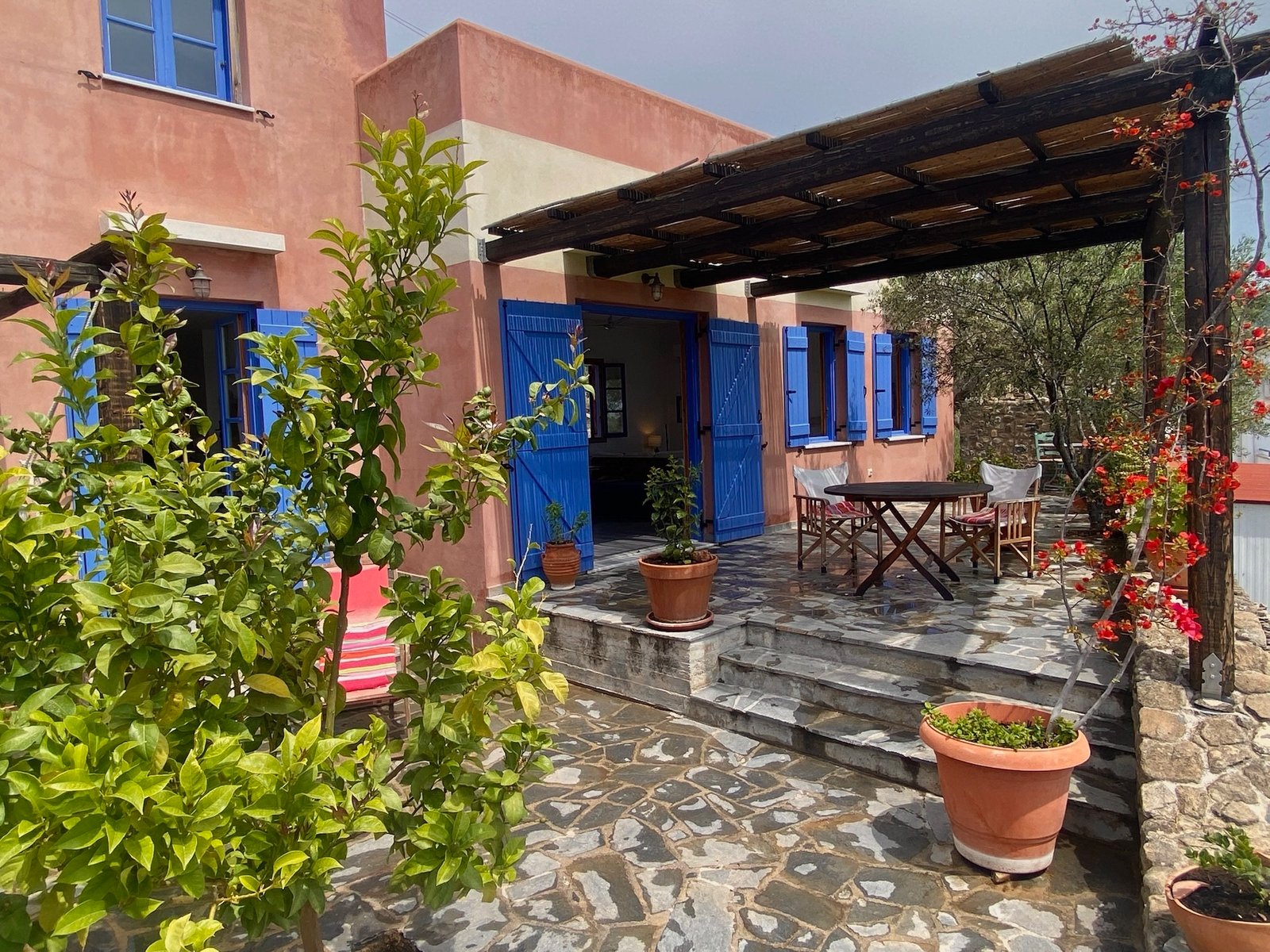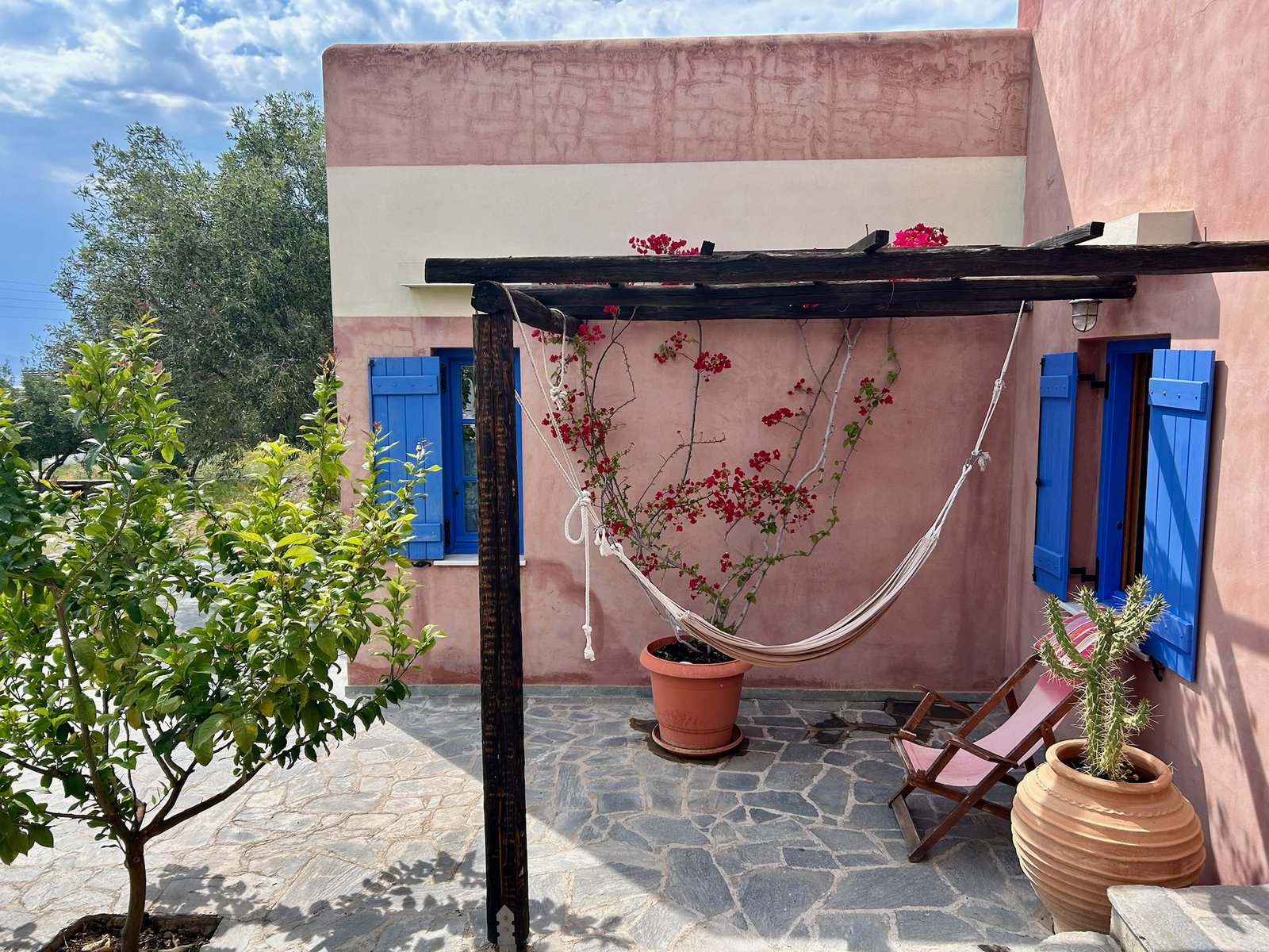 Large shaded terrace with outdoor furniture and table. Big garden with greenery and trees. Reclining chairs, hammock and outdoor shower.